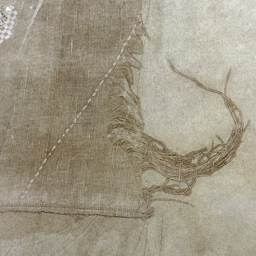 For twelve years, artists Denise Bookwalter and Lee Running have built a collaborative practice making artists’ books, textiles, garments, and prints. In Float, they continue their work with textile objects, exploring fabric as subject and medium. Clothing retains the story of the wearer. The works on paper and leather were developed before and after their artists’ book Fashioning. The series is made from excavated, dissected, and reconstructed clothing that captures the evidence of the hands and processes that made it, while also referencing the bodies that wore it. Floating sections of garments on top of each other and capturing their impression directly in paper, on copper etching plates, and in gold ink reveals their structure and unbinds them from their original form. The prints are evidence of the empathy found in the narratives of making and wearing.